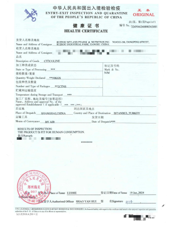 安康等级证书--胞磷胆碱 本新公司所原产的胞磷胆碱经审单,已顺遂赢得由国内 开支境审单检疫证设计构造签订批准的安康职业资格证书。