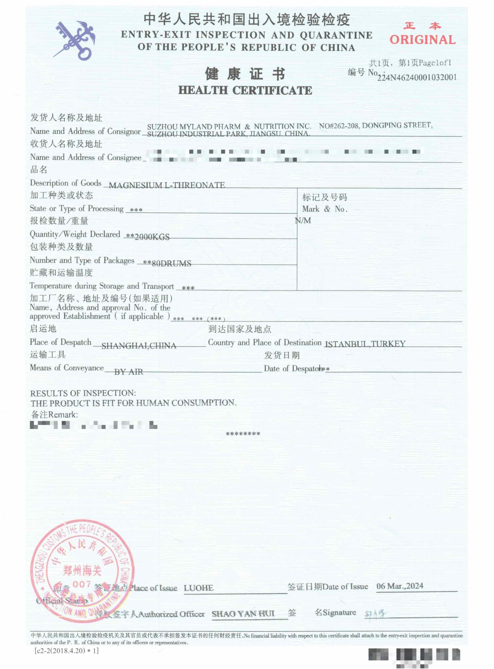 安康毕业证--苏糖酸镁 本工司所主产地的苏糖酸镁经查证,已顺遂有由全国出入境查证动物检疫购造提供下发的安康计算机证书。